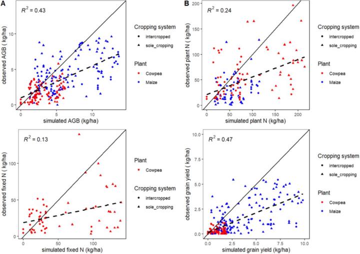Problem. Semi-arid regions of sub-Saharan Africa are characterized by highly variable rainfall and low inherent soil fertility. Maize-cowpea intercropping may offer the prospect of increasing and stabilizing crop productivity in these regions. However, the performance of such cropping systems often varies considerably in space and time. Objective. The main objective of the study was to understand how farmer context and rainfall variability influence the performance of maize-cowpea intercropping, using on-farm field experiments together with soil-crop model simulations to compute water and nitrogen stress. Methods. The data used in this study was generated from twelve on-farm trials during two cropping seasons (2021/22 and 2022/23) in semi-arid Zimbabwe. Three maize (Zea mays L.) varieties, one cowpea (Vigna unguiculata (L.) Walp.) variety and two cropping systems - either sole or intercropped - were tested. The STICS soil-crop model was parameterized to reproduce crop growth in the on-farm trials and compute water and nitrogen (N) stresses. Linear mixed-effects models were used to assess the impact of experimental treatments and simulated water and N stresses on intercropping performance. Results. The Partial Land Equivalent Ratio (pLER – the ratio of intercropped productivity over sole crop productivity) for maize and cowpea greatly varied across farms and crop types. Maize variety did not significantly impact the pLER of maize and cowpea. Water stress and nitrogen (N) stress simulated by the model were significant predictors of variations in pLER; maize pLER for aboveground biomass significantly decreased with increasing simulated water stress, and maize pLER for grain yield significantly decreased with increased simulated N stress. Yet, average LER remained above one, regardless of the water or N stress on maize, because of a greater contribution of cowpea to LER when water and N stress on maize was high. Late planting was found to exacerbate maize water stress, while low total nitrogen in the top soil was significantly correlated with maize nitrogen stress. Conclusion. Our study reveals that the production benefits of maize-cowpea intercropping can be maintained, in conditions of high water and nitrogen stress in multi-year and multi-location on-farm experiments. Implications. Our findings confirm the assumption that intercropping is a useful approach to intensify and stabilize grain and fodder production in smallholder mixed crop-livestock farming systems in semi-arid environments.