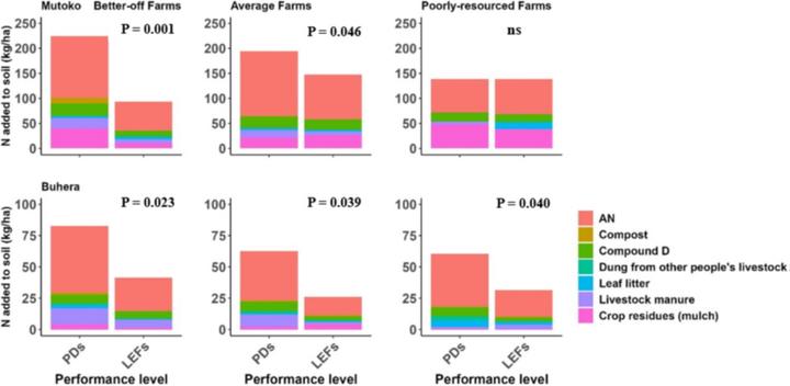 CONTEXT. in Zimbabwe, farm productivity of smallholder farmers practising mixed crop-livestock farming is hindered by climate variability, inadequate nutritious feeds, poor soil fertility, and resource trade-offs. Despite these challenges, positive deviants (PDs) within these communities achieve better outcomes using resources similar to those of other farmers. OBJECTIVE. This study sought to identify crop-livestock practices that enable PDs to outperform low-efficiency farms (LEFs) and to compare their farm productivity (energy output), nutrient quantities added to croplands, gross margins and return on investment (ROI) from crop production. METHODS. Data from a survey conducted in Mutoko and Buhera districts of Zimbabwe in 2021 were used to derive a farm typology per district and identify PDs and LEFs within farm types. Selected farms were subjected to detailed surveys to identify their specific practices. RESULTS AND CONCLUSIONS. Compared to LEFs, PD farmers achieved significantly greater crop productivity — by 86 %, 89 % and 28 % — and livestock productivity — by 156 %, 101 % and 136 % on better-off, average and poorly-resourced farms, respectively. PDs had larger cropping areas (on average 42 % more) and owned more livestock (39 % more TLUs) than LEFs, but this does not fully explain differences in productivity. PDs used more inputs (fertilizer, labour and others) for crop production than LEFs and added more carbon and nitrogen to their soils. In both districts, PDs consistently outperformed LEFs in gross margins and ROI. The differences in economic performance between PDs and LEFs were more pronounced among the better-off farmers. Key practices contributing to PDs’ success included recommended fertilizer use, timely operations, livestock supplementary feeding, fodder production, and adherence to extension advice. Financial shortages for the purchase of seeds, fertilizers, and veterinary drugs and poor access to information are potential hindrances to the adoption of PD practices by LEF farmers. SIGNIFICANCE. The combination of a farm typology and the PD approach helped to tailor recommendations to farms differing in resource-endowment, based on successful practices implemented in the region.